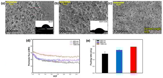 Effect of SNP size on silica particulate membrane fouling; SEM images (5000×) and CA of membrane surface: (a) 400 nm, (b) 900 nm, and (c) 1300 nm. Effect of silica nanoparticle size on: (d) change of flux in regard to the function of the VCF, and (e) the fouling ratio (J/J0).