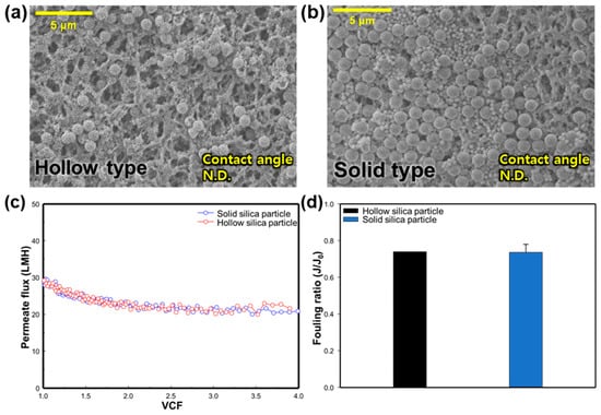 Effect of SNP type on silica particulate membrane fouling; SEM images (5000×) and CA of membrane surface: (a) hollow-type silica particles, and (b) solid-type silica particles. Effect of silica nanoparticle type on: (c) change in the flux in regard to the function of the VCF, and (d) the fouling ratio (J/J0).