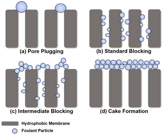 There are four types of membrane fouling models: pore plugging, standard blocking, intermediate blocking, and cake formation (Figure 7). Foulants that are similar in size or larger than the membrane pores can be deposited on the membrane surface, causing pore plugging (Figure 7a). If the foulant size is smaller than the pore size, it enters the pores and attaches to the inner pore surface (Figure 7b). Intermediate blocking occurs when some foulants accumulate inside the pores, and others accumulate on other deposited foulants (Figure 7c). When a uniform foulant layer is formed on the membrane surface, cake filtration occurs (Figure 7d) [34,35,36,37]. It seems that despite efforts to explore the unique factors driving membrane fouling in MD, the results did not significantly differ from those observed in typical pressure membrane systems like microfiltration (MF). Although MD operates differently and has distinct mechanisms compared to pressure membranes, the phenomenon of particulate membrane fouling appears to show similar patterns to MF due to the rejection of particulate substances by similar pore-sized membranes.