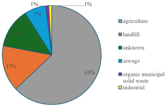 Biogas is regarded as a renewable energy carrier that may substitute conventional energy sources. Hence, its production is well established and globally promoted. In 2022, biogas production in Europe amounted to 21 billion cubic meters (bcm) [1], and undoubtedly, there is still significant potential for further increase in biogas production. Indeed, according to the European Biogas Association data [2], it is believed that the biogas production can double by 2030. Basically, biogas is generated as a result of a biochemical conversion of organic matter via a four-step anaerobic digestion (AD) process. For this purpose, the main feedstocks used in Europe are agricultural wastewaters, landfills and sewage sludges (Figure 1). Correspondingly, it has been widely reported that AD is an energy-efficient, environmentally sustainable and marketable process for bioenergy production [3,4,5,6,7,8].