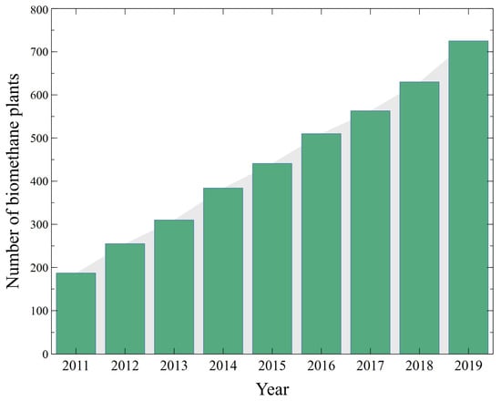 Undoubtedly, methane (CH4) is the most important component of biogas. Surprisingly, biogas generated from AD is characterized by a slightly higher CH4 content than that produced from landfills [10]. It must be stressed that CH4 is a valuable source of energy as it is characterized by a higher calorific value than biodiesel, bioethanol and biomethanol [11]. Therefore, the global biogas and biomethane markets have been growing over the last years [12]. Furthermore, as displayed in Figure 2, the number of biomethane plants have systematically increased [13].