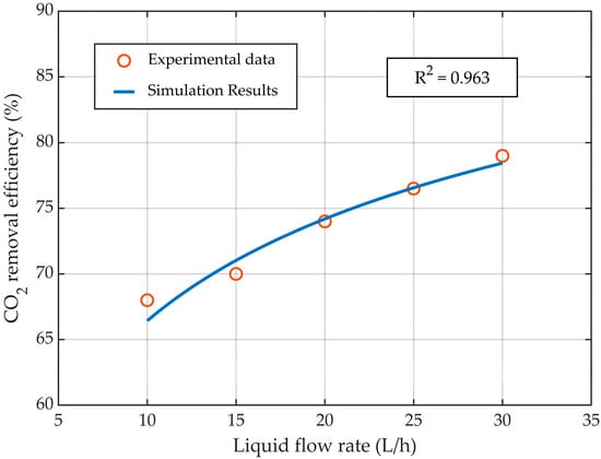 By increasing the liquid flow rate and maintaining a constant gas flow rate, the absorption efficiency of CO2 showed an increase (Figure 4) due to the rise in the amount of MEA that flowed inside the HFMC and reacted with the absorbed CO2. Comparing the experimental data with the simulation results, a very good correlation was observed, with an R2 = 0.963. The CO2 removal efficiency was increased from about 66.5% to nearly 79% for values of the liquid flow rate ranging from 10 L/h to 30 L/h, respectively.