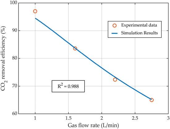 While maintaining the liquid flow rate constant at 25 L/h, the increase in the gas flow rate determined a decrease in CO2 capture rate (Figure 5) due to the reduction in the CO2 residence time inside the HFMC. The experimental data and the simulation results exhibited a very good correlation, with an R2 value of nearly 0.99. By increasing the gas flow rate from 1 L/min to 2.75 L/min, the CO2 absorption efficiency decreased from 94.5% to nearly 65%, respectively.