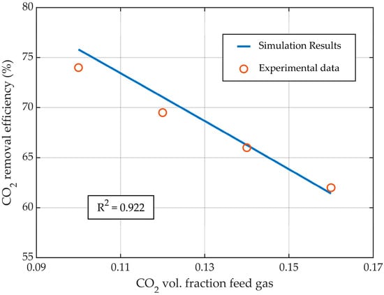 The increase in the concentration of CO2 in the inflow gas led to a decrease in the absorption efficiency of CO2 (Figure 6), while maintaining constant gas and liquid flow rates, due to the increase in the amount of CO2 in the gas phase. The simulation results were in good agreement with the experimental data, with an R2 = 0.922. Changing the CO2 concentration in the inflow gas from 0.1 to 0.16 vol. fraction, the CO2 removal efficiency was decreased from nearly 76% to 61.5%, respectively.
