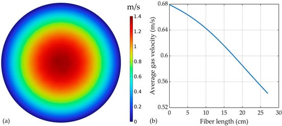 Figure 7. (a) Gas mixture velocity profile inside the tubes, (b) average gas velocity profile along the HFMC length. Gas flow rate of 2 L/min.