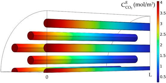 The CO2 concentration in the gas phase inside the membranes (tubes) decreased over the length of the membranes, from about 4.06 mol/m3 at the tube inlet to nearly 0.62 mol/m3 at the outlet, resulting in a CO2 absorption efficiency of about 84.7% due to the absorption in the liquid phase (Figure 9). The concentration was maximum in the middle of the tubes and was decreasing in the radial direction of the tubes and along the membrane thickness due to diffusion.