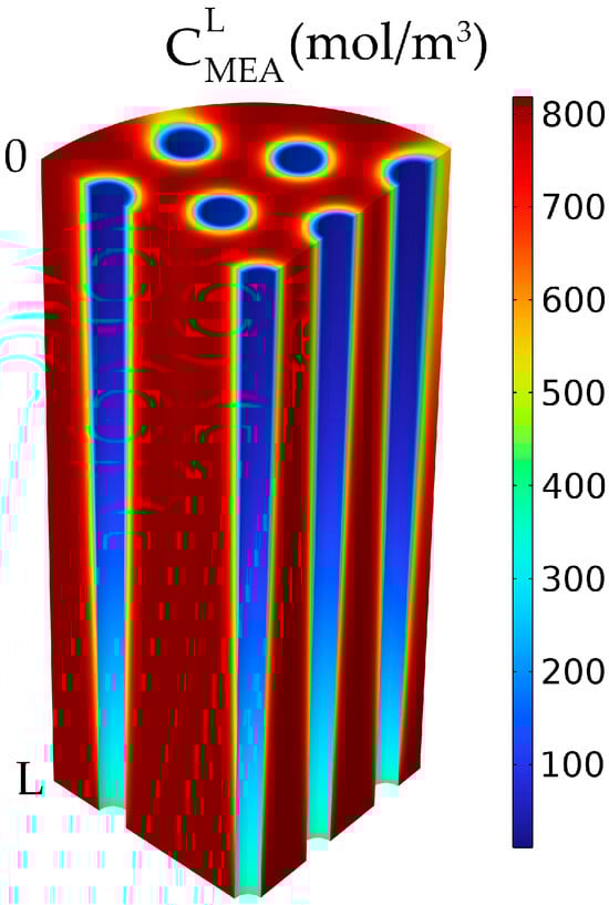 For the absorbent solution, which flows between the membranes in the shell, the MEA concentration was also decreasing along the membrane length and around the membranes due to the reaction with the absorbed CO2 (Figure 10). The MEA concentration decreased along the length of the membranes from 818 mol/m3 at the inlet to about 720 mol/m3 at the exit of the HFMC. The concentration decreased around the membranes and was lower closer to the membrane walls due to the reaction with the absorbed CO2 from the gas phase, while a higher concentration was seen further in the liquid phase, far from the membranes. The absorbed CO2 reacted first with the MEA close to the membrane walls, then the CO2 diffused inside the liquid phase further into the liquid solution, which resulted in the concentration gradient around the membranes.