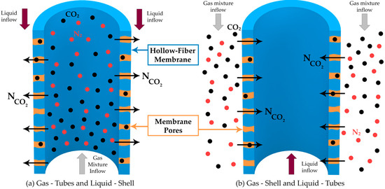 In the first case, the gas mixture flowed inside the membranes and the liquid MEA solution between them (Figure 11a), while in the second case, the liquid flow was considered inside the membrane and the gas between them (Figure 11b). In both cases, counter-current flow was assumed, with constant flow rates and compositions.