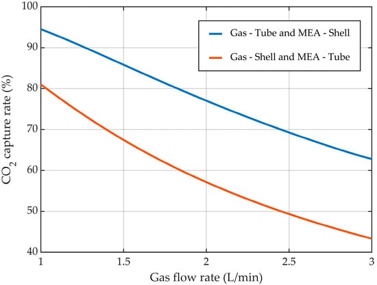 Regardless of flow configuration (Figure 11), increasing the gas flow rate showed a decrease in the absorption rate of CO2 (Figure 12) due to the decrease in the overall residence time for the gas phase. When the gas mixture flowed inside the membranes and the liquid aqueous MEA solution between them (Figure 11a), the absorption efficiency decreased from about 94.5% at a gas flow rate of 1 L/min to 62.8% at a gas flow rate of 3 L/min. In the other case, when the gas mixture passed between the membranes and the liquid absorption solution ran inside them (Figure 11b), the CO2 capture rate decreased from 81% at a gas flow rate of 1 L/min to 43.3% at a gas flow rate of 3 L/min. Over the entire range of gas flow variation, the absorption efficiency was considerably higher for the case when the gas mixture flow inside the membranes and the liquid solution between them (Figure 11a). At a gas flow rate of 1 L/min, the difference in absorption efficiency between the two configurations was 13.5%, while at a gas flow rate of 3 L/min, the difference increased to 19.5%.