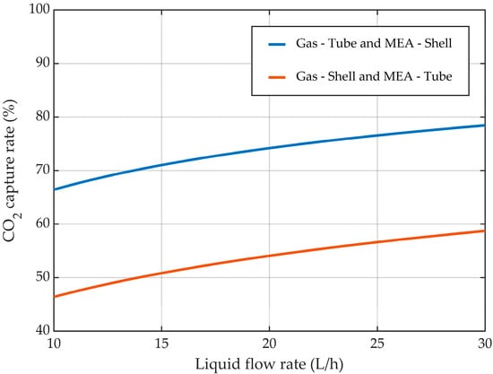 The effect of the liquid flow rate considering the two different flow configurations inside the HFMC is represented in Figure 13. The increase in the liquid flow rate resulted in an increase in the CO2 capture rate. When the gas mixture flowed inside the membranes and the liquid aqueous MEA solution between them, the absorption efficiency increased from about 66.5% at a liquid flow rate of 10 L/h to nearly 78.5% at a liquid flow rate of 30 L/h. In the other case, when the gas mixture passed between the membranes and the liquid absorption solution inside them, the CO2 capture rate increased from 46.5% at a liquid flow rate of 10 L/h to 58.8% at a liquid flow rate of 30 L/h. Along the entire range of investigated liquid flow rates, the absorption efficiency was considerably higher in the case when the gas mixture ran inside the membranes and the liquid solution between them, with a near constant difference between the two cases of around 12.2%.