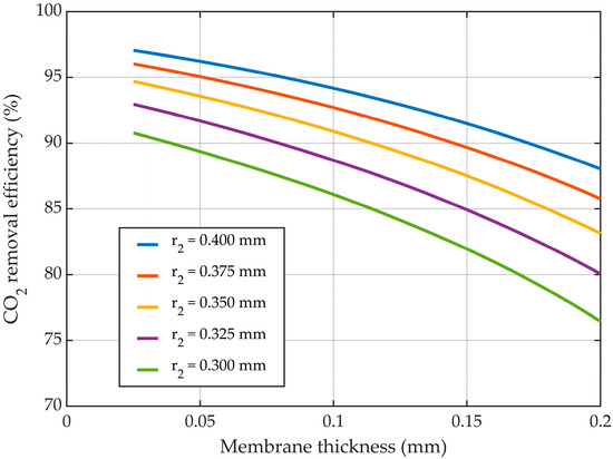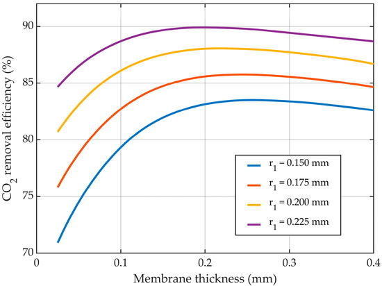 The effect of the membrane thickness for a constant inner radius on the CO2 removal efficiency is represented in Figure 18. At a membrane inner radius of 0.2 mm, by increasing the membrane thickness from 0.025 mm to 0.4 mm, the CO2 removal efficiency was increased from around 81% to a maximum of about 88% at a thickness of 0.22 mm, after which the removal efficiency decreased to nearly 87%. At different values for the membrane’s inner radius, the maximum values of absorption efficiency were seen at various values for membrane thickness. With increasing inner radius values, the absorption efficiency peaked at lower values for the membrane thickness. For an inner radius of 0.225 mm, the maximum value for the removal efficiency (i.e., nearly 90%) was observed at a thickness of 0.2 mm, while for the lowest inner radius of 0.15 mm, the maximum (i.e., about 83.5%) was noticed at a membrane thickness of around 0.26 mm.