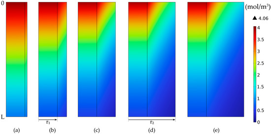Figure 19. CO2 gas concentration profile in tubes and membranes over the membranes’ length and radius, at a constant membrane inside radius r1 = 0.2 mm. (a) r2 = 0.225 mm, (b) r2 = 0.3 mm, (c) r2 = 0.4 mm, (d) r2 = 0.5 mm, (e) r2 = 0.6 mm. C MEA , 0 = 818 mol/m3 (5 wt%), C CO 2 , 0 = 4.06 mol/m3 (10 vol%), Qg = 2 L/min, QL = 25 L/h.