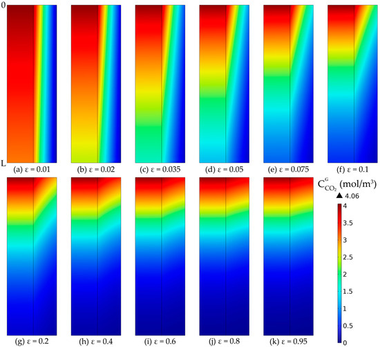 The CO2 concentration profiles inside the membrane tube compartments and inside the membranes, at different porosities, are represented in Figure 21, considering the same membrane dimensions in all cases. In all cases, the CO2 concentration in the gas phase decreased along the tubes and length and radius of the membranes due to the absorption in the aqueous MEA solution. Because of the diffusion phenomena, a concentration gradient was observed, with the gradient being more pronounced in the membranes compared to the tubes. At a lower porosity, the final concentration of CO2 in the purified gases was higher than at a higher porosity, resulting in an improvement in the absorption efficiency with the increase in the membranes’ porosity. At a porosity of 0.01, the CO2 concentration in the gas phase at the exit reached nearly 3.07 mol/m3 (Figure 21a), but increasing the porosity to 0.1 resulted in a decrease of the exit concentration to around 0.69 mol/m3 (Figure 21f), and further increasing the porosity to 0.8 led to a decrease in CO2 concentration to around 0.12 mol/m3 (Figure 21j).