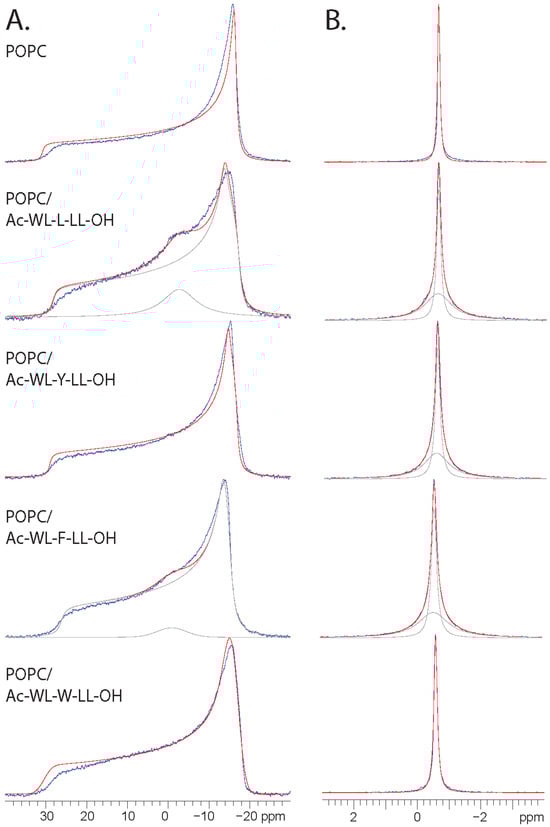 where σ∥ and σ⊥ are the shielding tensors along and perpendicular to the bilayer normal, respectively, and σi represents the isotropic chemical shift. Simply put, the 31P CSA of phospholipids is determined from the width of the static line-shape. The lipid bilayer morphology and fluidity are highly susceptible to changes in composition []. Upon the introduction of foreign components, lipids can be affected homogeneously, or distinct local environments can form [,]. This depends on the properties of the introduced species. The Ac-WL-X-LL-OH pentapeptide reportedly does not adopt a secondary structure and partitions exclusively into the membrane interface []. The spectral deconvolution of static 31P and MAS 31P NMR can reveal magnetically inequal phospholipid headgroups belonging to different environments.