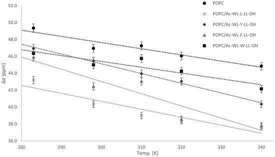 All the POPC/peptide samples were investigated at temperatures between 283 and 340 K and indicated the persistence of the guest residue rank order established in Section 3.1. The temperature range is above the POPC Tm of −2 °C; thus, the bilayer is fluid at all the investigated temperatures. The extracted Δσ of the static 31P NMR spectra (included in SI, Figures S19–S23) are plotted in Figure 3. A decrease in phospholipid CSA in the presence of Ac-WL-X-LL-OH was observed for all the guest residues X at all the investigated temperatures. The influence on CSA based on X followed the same order, L > F > Y > W, established at 298 K for all but one datapoint (which was within the estimated uncertainty). As expected, there were correlations between the bulk lamellar line-shape Δσ and temperature for all the samples, as is indicative of increased molecular motion in the phospholipid bilayer [,]. The temperature dependency of all the lipid/peptide systems followed a linear trend, with steeper curves than those for pure POPC, indicating the increased temperature sensitivity of phospholipid mobility in presence of the pentapeptides, with the exception of the Trp-peptide.