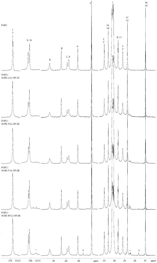 To obtain a better understanding of the role of the aromatic amino acids in PMP–membrane binding, it would be useful to determine their depth of membrane insertion using model peptides. Indeed, there are several established techniques for determining the localization of peptides in the membrane domain, such as fluorescence quenching [] and solid-state NMR (ssNMR) [,]. White and coworkers concluded from ssNMR experiments with indole, the side-chain of Trp, and three indole-analogues that Trp resides at the membrane interface []. However, to our knowledge, there are no published studies on the depth of insertion of the residues that are associated with membrane interactions of PMPs, particularly the aromatic amino acids. Atomic-level insight can be gained via ssNMR of lipid membranes without perturbing the membrane, and this is a useful technique for studying the effects of any embedded molecules [,,,,,,]. The amount of foreign components is generally low compared to the lipid and is below the detection limit of 13C NMR for direct analysis. Still, magic angle spinning (MAS) 13C NMR can give detailed information about the effects of peptide introduction on the lipid backbone, i.e., from the perspective of the lipid for the POPC/Ac-WL-X-LL-OH system. It should be pointed out that in their original paper, Wimley and White observed the peptide directly []. Determining depth of membrane insertion of foreign components has commonly been performed by isotope enrichment [] or addition of paramagnetic probes [,,,]. NMR experiments such as REDOR [] and dipolar recoupling experiments [,] have been successful in characterizing the effect of foreign components on lipid membranes and do not require additional sample preparation. Regular 1D 13C MAS NMR has also been used for estimating the insertion depth of introduced foreign components in a phospholipid membrane [,,] and was chosen for the herein investigated POPC/Ac-WL-X-LL-OH system due to its simplicity. Additionally, 31P NMR can afford insights into lipid macrostructure(s) and dynamics. The statistical distribution of headgroup 31P nuclei give rise to characteristic static 31P line-shapes depending on the lipid phases [,,], which are useful for determining organization/packing. 31P ssNMR has been proven to be an effective tool to determine the effect of small peptides on phospholipid membranes [,]. For instance, Naito et al. showed that the peptide dynorphin increases the temperature sensitivity of phospholipid membranes [].