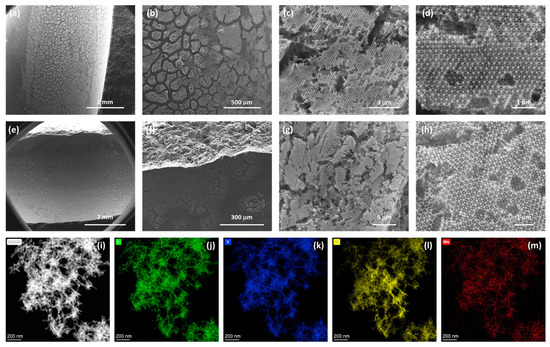 SEM images of Mo-BiVO4 coatings on the (a–d) shell and (e–h) lumen surfaces of the UF membranes at different magnifications. (i) TEM image of the Mo-BiVO4 inverse opal and the corresponding (j) Bi; (k) V; (l) O; and (m) Mo EDX elemental maps.