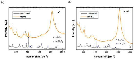 Micro-Raman spectra of the Mo-BiVO4 coated membranes in comparison to the bare UF ceramic support using: (a) ×5 and (b) ×100 microscope objectives at 532 nm. Squares and circles indicate the α-Al2O3 and t-ZrO2 Raman modes, respectively, while vertical lines depict the Mo-BiVO4 Raman bands.