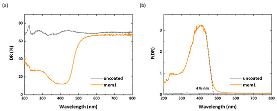 (a) Diffuse reflectance (DR%) spectra and the (b) corresponding Kubelka–Munk transforms F(DR) for the Mo-BiVO4 coated membranes in comparison to the bare UF ceramic support.