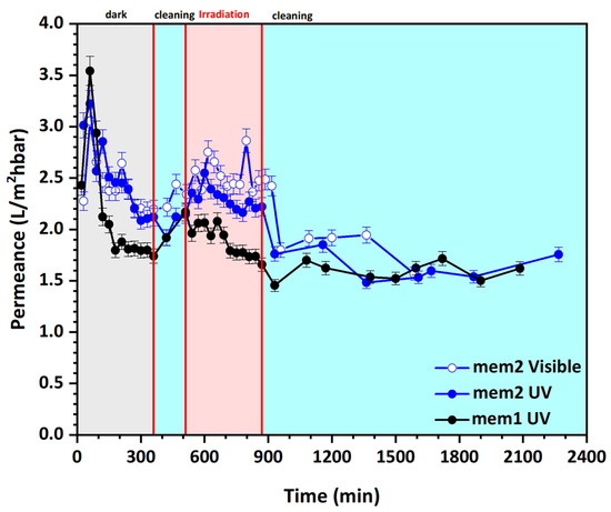 Moreover, concerning the permeance of mem2 (Figure 5) under vis-light exposure, it demonstrates a similar or slightly increased permeance compared to its UV condition. It is worth noting that despite fluctuations, both membranes exhibit consistently stable permeance levels throughout the observed period, underscoring the robustness of the photocatalytic coatings.