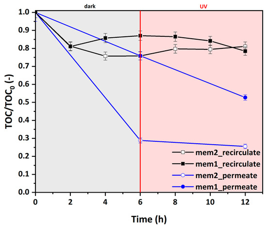 Evolution of the total carbon (TOC) content normalized to the initial TOC0 for the two Mo-BiVO4 photocatalytic membranes in the permeate effluent and in the recirculation vessel during the experiments under dark and UV conditions. Dark conditions and UV irradiation periods are indicated by shaded grey and light red areas, respectively.
