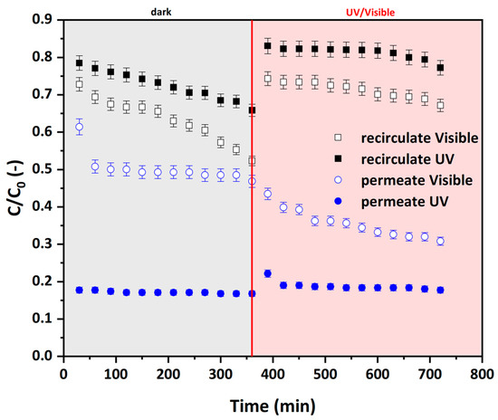 Comparison of the normalized tetracycline concentration over time between the permeate effluent and in the recirculation vessel during experiments conducted in both dark conditions and under irradiation (UV and vis-light) for mem2. Dark conditions and UV/visible irradiation periods are indicated by shaded grey and light red areas, respectively.