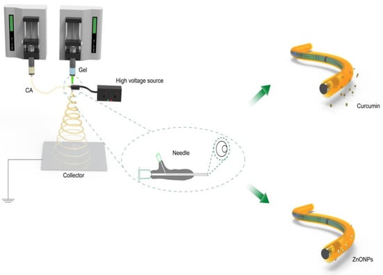 - Chen, X.; Liu, Y.; Liu, P. Electrospun Core–Sheath Nanofibers with a Cellulose Acetate Coating for the Synergistic Release of Zinc Ion and Drugs. Mol. Pharm. 2024, 21, 173–182. [Google Scholar] [CrossRef] [PubMed]