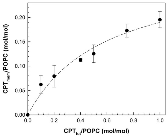 This finding led to the need to determine the actual concentration of CPT incorporated into the membrane. Mixtures of POPC and CPT at various initial proportions were prepared, and the incorporated CPT was determined (Figure 2). The actual CPT/POPC membrane molar ratio showed a hyperbolic dependence with the total initial concentration of CPT. Thus, the data shown in Figure 2 were adjusted to the following equation: