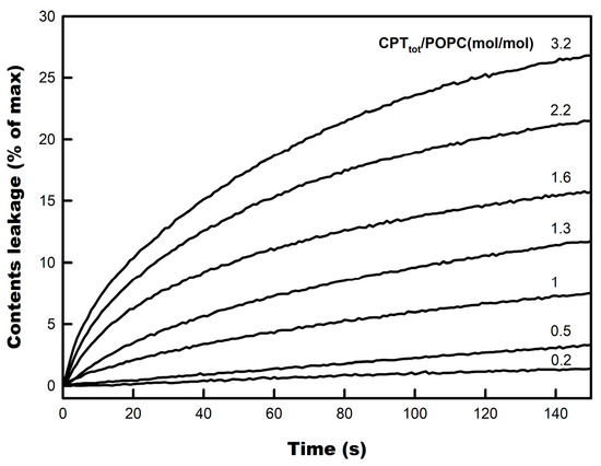 The rate and extent of CPT-induced leakage continued progressively increasing as its concentration was raised above that ratio, indicating that the Rsat value was not reached. These results indicate that a fraction of added CPT rapidly incorporated into the POPC membranes and compromised their barrier function, resulting in increased permeability to water-soluble compounds, like CF.