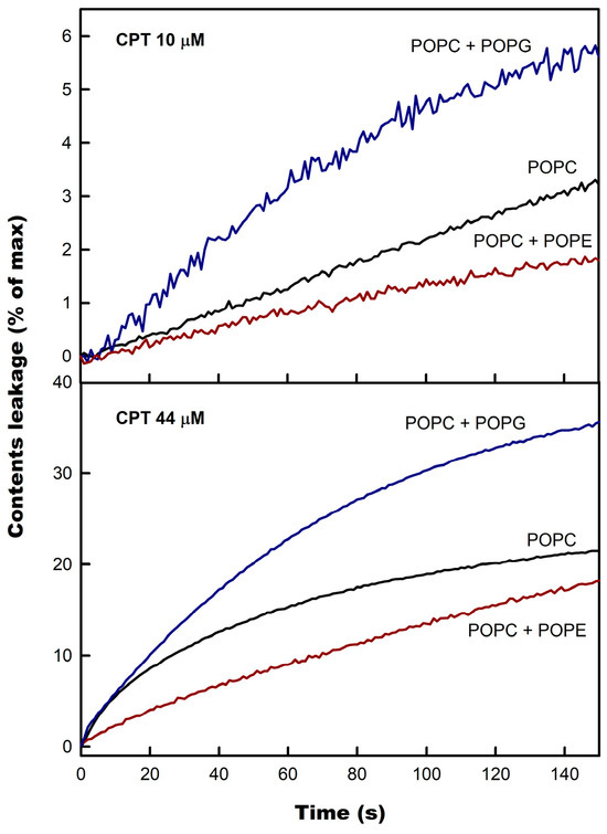 The influence of phospholipid membrane composition on CPT-induced leakage was checked in liposomes containing an addition of either POPG or POPE (Figure 4). POPE was selected because of its small headgroup and rich lipid polymorphism [34], whereas POPG has an anionic character and a voluminous headgroup [35].