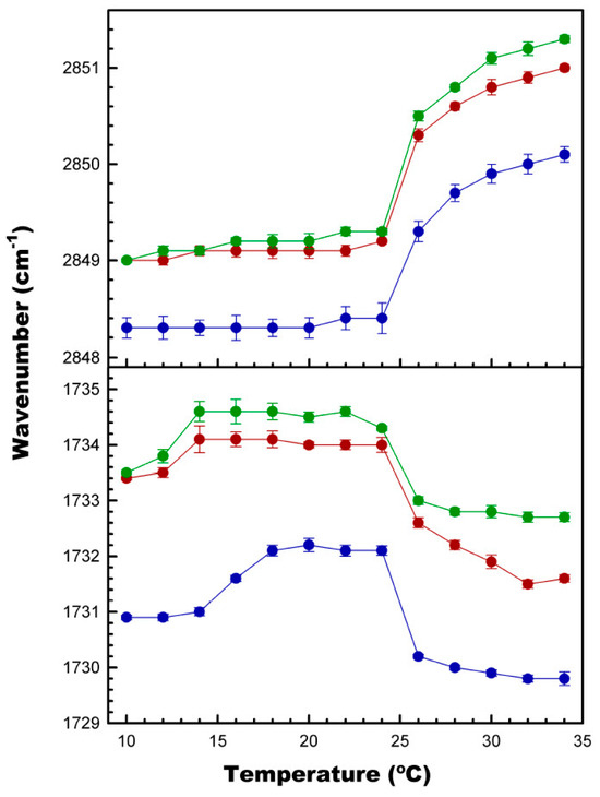 The effect of CPT on the region of the DMPC acyl chains and polar headgroups, determined by FTIR. Top: the effect on the maximum frequency of the νCH2 symmetric stretching band. Bottom: the effect on the maximum frequency of the νCO stretching band. Plots correspond to pure DMPC (blue), and CPTtot/DMPC (mol/mol) 0.1 (red) and 0.25 (green). Spectra were collected from 10 to 34 °C, every 2 °C. Data correspond to the mean of three independent repetitions ± SD (error bars).