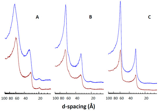Effect of CPT on the SAXS profiles of DMPC. Diffractograms correspond to pure DMPC (red) and CPTtot/DMPC 0.1 (mol/mol) (blue), at 7 °C (A), 18 °C (B), and 34 °C (C).