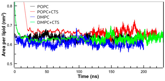 The area per lipid parameter is frequently used as a property of a lipid bilayer for validating MD simulations [48]. Figure 8 shows the time course of the area per lipid in different simulations.