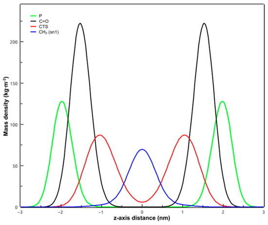 Mass density profiles along the z-axis of the simulation box of the simulated system of POPC + CPT. POPC phosphorus atoms are in green, CPT in red, POPC terminal methyl of sn-1 chains in blue, and POPC carbonyl groups in black. Curves are symmetrized around the center of the bilayer.