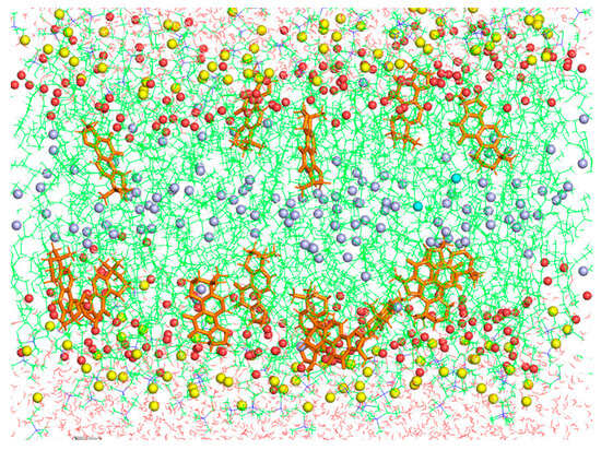 Final snapshot of the simulation box of POPC + CPT membranes. Water molecules are shown in red lines, CPT in orange sticks, POPC atoms in green lines, POPC carbonyl groups in red spheres, POPC methyl terminals of sn-1 chains in blue spheres, and phosphorous atoms in yellow spheres.