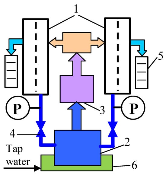 UF installation with two plate-and-frame modules. Here, 1—membrane module, 2—feed tank, 3—pump, 4—needle valve, 5—measurement cylinder, 6—water bath, and P—manometer.