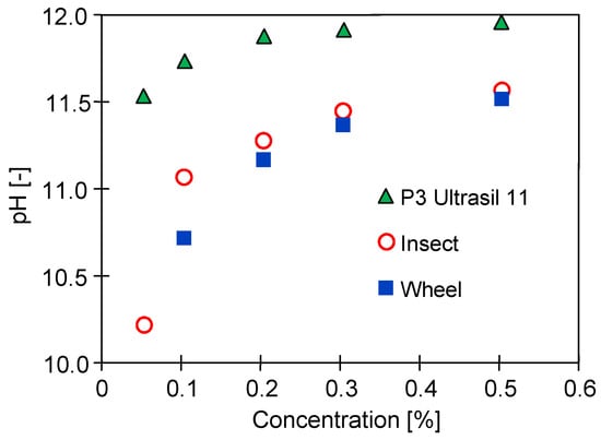 Changes in pH value depending on the concentration of P3 Ultrasil 11, Wheel, and Insect in cleaning solutions.
