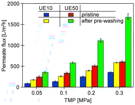 Since the commercial UE10 and UE50 PES membranes used in the studies contained preservatives, they were soaked (1 day) and then rinsed with deionized water prior to UF testing. For pristine membranes prepared in this way, the maximum permeate flux (Jmax) at TMP = 0.2 MPa was 137 L/m2 h for UE10 and 338 L/m2 h for UE50. It was previously reported that washing pristine membranes in an alkaline solution results in the more effective removal of preservative-blocking pores [31,35]. This was also confirmed in the present study (Figure 3). The application of Insect solution for washing pristine membranes (2 h, TMP = 0) resulted in an increase in Jmax from 137 to 396 L/m2h for UE10, and from 338 to 1113 L/m2h for UE50 (TMP = 0.2 MPa). A greater increase was found for UE50 membranes (about 3.3 times) compared to UE10 (about 2.9 times), as the former membranes with a claimed MWCO of 100 kDa had larger pores than the latter (10 kDa). In addition to the removal of preservatives, the observed increase in flux can also be attributed to an increase in pore size after rinsing the PES membranes with alkaline solutions [38]. It has been shown that the contact of the polymer membrane with NaOH solution causes the loosening of the polymer chains and as a result, the skin layer becomes more permeable to water [32,35].