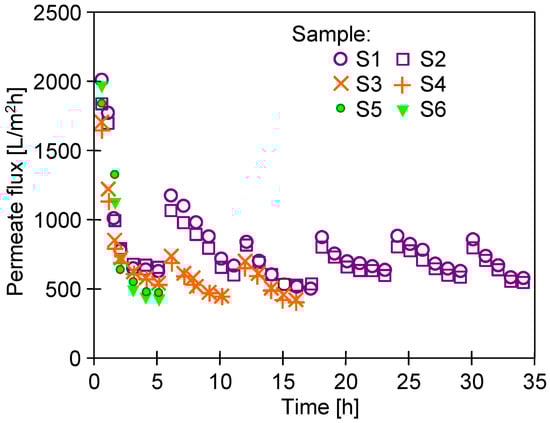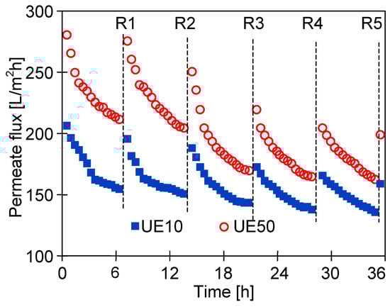 However, the increase in Jmax observed after membrane pre-washing with the Insect solution was unstable. In the following hours of deionized water filtration, a systematic decrease in the permeate flux was observed. For the UE10 membranes, the permeate flux (TMP = 0.3 MPa) stabilized at the level of 320–350 L/m2h. In the case of the UE50 membranes, after 5–6 h of membrane compression, the flux stabilized at the level of 500–600 L/m2h (Figure 4). Similarly, large flux decreases in the initial period of the exploitation of PES membranes were presented in [28]. The tested UE50 membrane samples (S1–S6) were taken from various places on the 30 × 60 cm sheet. The different initial permeate flux values indicated some heterogeneity in the large membrane sheets produced. Differences in flux for commercial membranes were also reported previously [35]. However, these differences disappeared after 5–10 h of the process, and comparable permeate flux values were obtained (Figure 4).