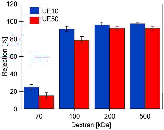 Chemical agents, by changing the structure of the membrane surface, cause not only changes in membrane permeability but also in selectivity, which was assessed in this study by examining the dextran rejection. The initial values obtained for compacted pristine membranes are presented in Figure 5. Despite a significant difference in the MWCO values declared by the manufacturers (UE10—10 kDa and UE50—100 kDa), both types of membranes showed similar separation properties. The UE50 membranes, due to their higher initial permeability, are more prone to fouling [13]. Thus, improved rejection for the UE50 membranes could be due to higher fouling intensity, as the deposit reduces the permeate flux and simultaneously improves the separation properties of the membranes [21]. The MWCO values different than those claimed by the manufacturer for PES membranes were also found in previous work [39]. During the filtration of surfactant solutions, this was explained by the concentration polarization, especially at higher fluxes [40]. Increasing the surfactant concentration in the polarization layer in the vicinity of the membrane surface can lead to monomer and micellar formation, and as a result, the PES 30 kDa membrane removed 60–80% of the anionic surfactants, similar to the PES 10 kDa [41].