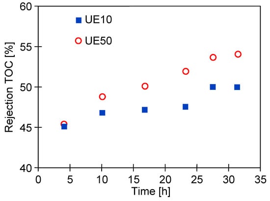 The formation of deposits on the membrane surface usually improves the membrane’s separation properties [21]. This was confirmed by the results of the TOC analysis, which showed that during wastewater filtration (Figure 6) the retention of organic compounds increased with the process time (Figure 8). In the tested case, the flux decreased by 20% for the UE10 membranes, and by 29% for UE50, which indicates that fouling was greater in the former case. As a result, a slightly higher TOC rejection was obtained for the UE50 membrane.
