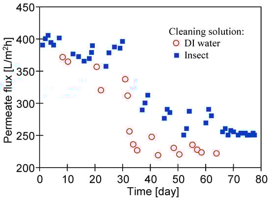 Changes in the maximum permeate flux (feed—DI water) during 8 weeks of the filtration of the 0.5% Insect solution. The process was conducted for 6–7 h per day, after which the installation was rinsed and filled with DI water overnight. Subsequently, Jmax was measured using DI water.