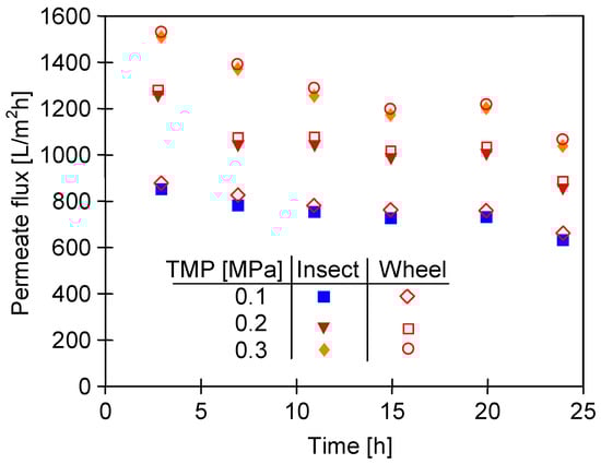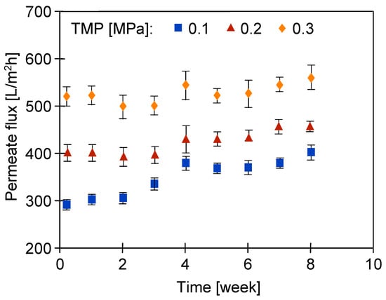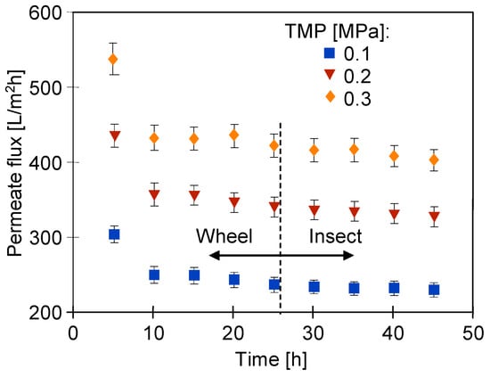 After 78 days of UF tests (Figure 9), the membranes were washed several times using 0.5% solutions of Wheel (25 h) and Insect (20 h). During this procedure, the membranes in the modules were washed for 5 h/day, then the alkaline solution was replaced with DI water and the pure water flux was determined (Figure 10). Despite long-term contact with the alkaline solution, no such significant increase in the flux was observed for the pristine membranes (Figure 3). However, the membrane performance stabilized at a level appropriate for a given TMP value.