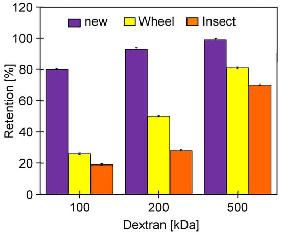 After 25 h of using the Wheel solution, it was replaced with an Insect solution, which, however, did not significantly change the values of the pure water flux (Figure 10). Although the change in cleaning solutions had no effect on JPWF, the dextran separation studies showed that the additional 20 h of washing with Insect solution resulted in a decrease in retention (Figure 11). The pristine membranes rejected over 93% of the 200 kDa dextran and almost 100% of the 500 kDa dextran. After 78 days of the UF process (Figure 9) and 25 h of washing with the 0.5% Wheel solution, the 500 kDa separation decreased to 82%, and after another 20 h of washing with the 0.5% Insect solution—to 71%. The retention coefficient of 100 and 200 kDa dextrans decreased by more than two-fold. This result indicates that the application of alkaline agents resulted in an increase in the pore size of the tested membranes. A significant reduction in the dextran rejection was also achieved during static tests in which the membranes were soaked in Insect and Wheel solutions for 18 months [22].