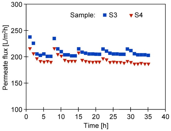 The fouling of the membranes caused by wastewater separation (Figure 7c,d) not only reduces membrane permeability, but the deposit can also protect polymer surfaces from the harmful action of NaOH [41]. Hence, in order to investigate the influence of alkaline agents on the destruction of the PES membrane, a 0.5% Insect solution was filtered through it for several weeks. It was already reported that contact with alkaline solutions causes the loosening and degradation of polymer chains [30]. Previous static tests showed that soaking the membranes in Insect and Wheel solutions for several months resulted in the removal of PVP from the membranes and the cracking of the PES chains [22]. Unlike static conditions, during the UF process in cross-flow modules, the generated shear forces can accelerate the removal of components such as PVP from the membrane matrix [17]. For this reason, in order to investigate the mechanism of the PES membrane degradation, in addition to washing the membrane surface (without any filtration), the experiments were conducted during which an alkaline solution flowed through their pores. Compressed pristine UE50 membrane samples were used for the tests (Figure 4, samples S3 and S4), through which the 0.5% Insect solution was filtered (TMP = 0.1 MPa) for 8 weeks. The UF process was carried out for 6–7 h per day, after which the installation was rinsed and filled with deionized water overnight. The process conducted in this way allowed the permeate flux to be stabilized after just 2 days of testing (Figure 13, from 15 h). After the night break, slightly higher flux values were obtained, which resulted from the decompression of the membranes during standstill and osmotic rinsing by deionized water. In the first week of the 0.5% Insect solution filtration, the permeate flux stabilized at around 200 L/m2h (sample S3) and 180 L/m2h (sample S4). In the following weeks, a slight increase in the permeate flux was observed.
