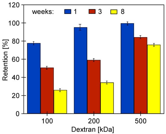 The increase in the permeability of the PES membranes due to the influence of the long-term filtration of the 0.5% Insect solution was confirmed by a decreased retention of dextrans (Figure 15). These changes increased with the time of the process. After 8 weeks, particularly large decreases in retention to the level of 20–30% were observed for dextran 100 and 200 kDa. After this time, the rejection of dextran 500 kDa decreased from 97 to 75%. A significant increase in water permeability and a decrease in the retention of dextran as a result of washing membranes with NaOH solution was also presented in [30]. In static tests, after 18 months of soaking in the Insect solution, the UE50 membranes retained dextrans more than twice as badly [22]. This result indicates that during cross-flow operation, the alkaline cleaning agents can cause membrane degradation to a much greater extent than that occurring during the long-term soaking of the membranes in these solutions.