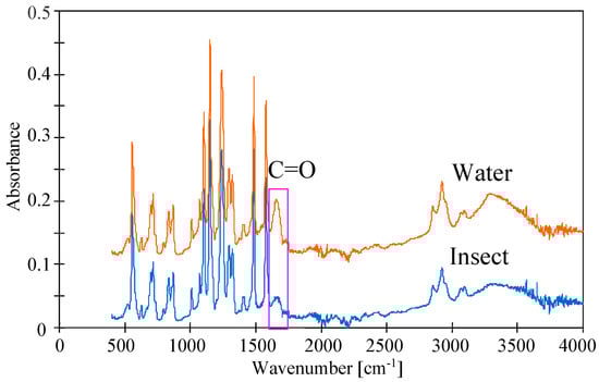 ATR-FTIR spectra of UE50 PES membranes after DI water filtration (water) and after 8 weeks of 0.5% Insect solution filtration (Insect).