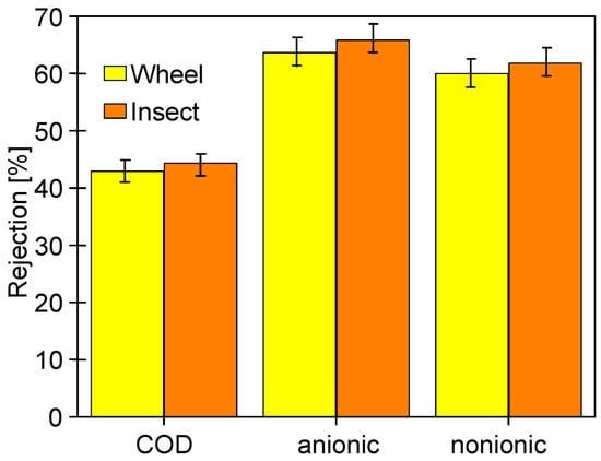 In order to analyze the influence of the long-term soaking of the membranes on their separation properties, the rejection of COD and surfactants present in the 0.5% Insect solution was determined (Figure 19). The membranes soaked in the 0.5% Wheel solution showed slightly higher permeability, so as expected, slightly lower retention (by 2–3%) was recorded for these membranes compared to those soaked in the 0.5% Insect solution. The rejection of the anionic surfactant was higher than that of the nonionic surfactant, both by the membranes soaked in Insect and Wheel solutions. Zeta potential measurements carried out after the UF tests showed that long-term contact with alkaline agents does not significantly change the electronegativity of the membrane surfaces (Figure 20). Due to the dissociation of the anionic surfactants, they were more strongly repulsed by the membranes, which increased their rejection. Similar conclusions for PES membranes based on Zeta potential changes were presented in other works [43,44].