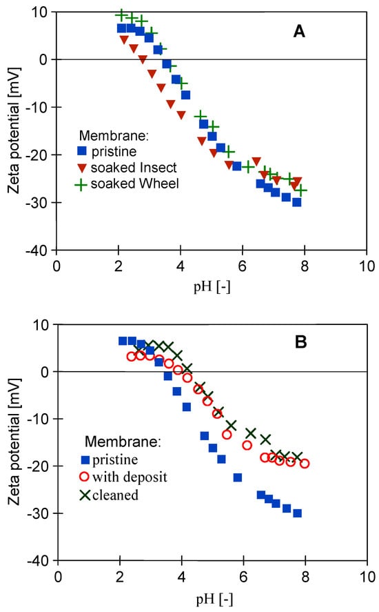 Comparison of the zeta potential of the surface of the pristine UE50 membrane: (A) soaked in the 0.5% Wheel solution and 0.5% Insect solution and (B) fouled during the UF of the synthetic wastewater (with deposit) and then cleaned.