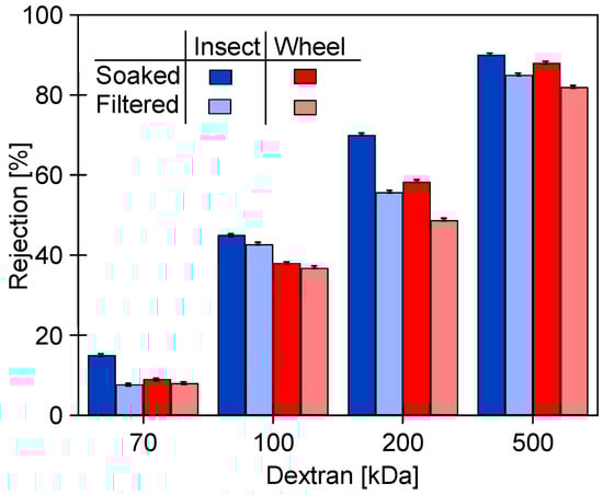 Dextran rejection by UE50 membranes soaked for 20 months in 0.5% Insect and 0.5% Wheel solutions, and then applied in 0.5% Insect solution filtration (24 h, Figure 18).
